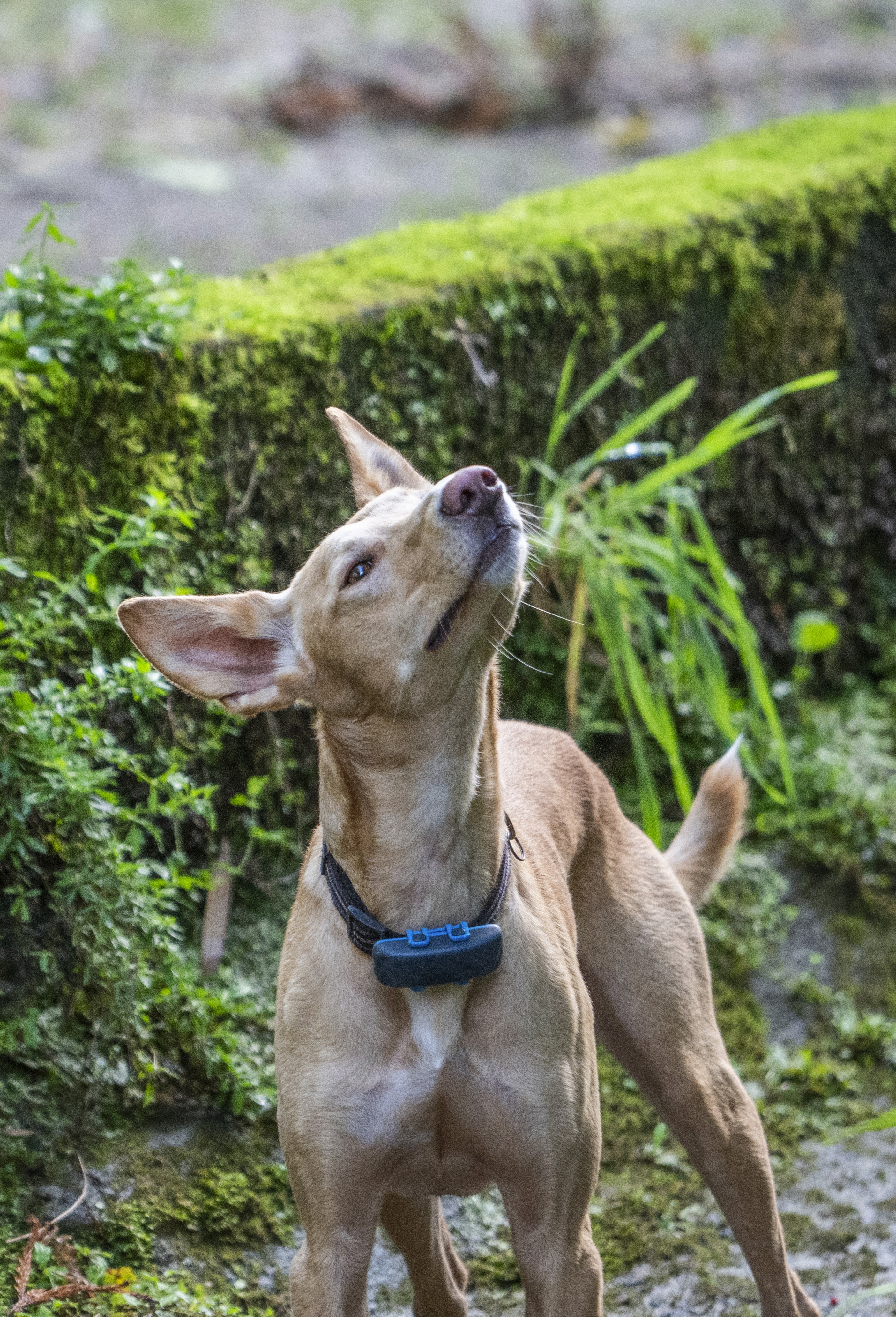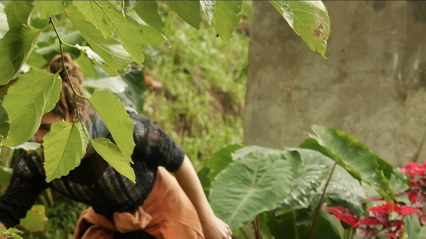 • Nestled between tall leaves in a food forest