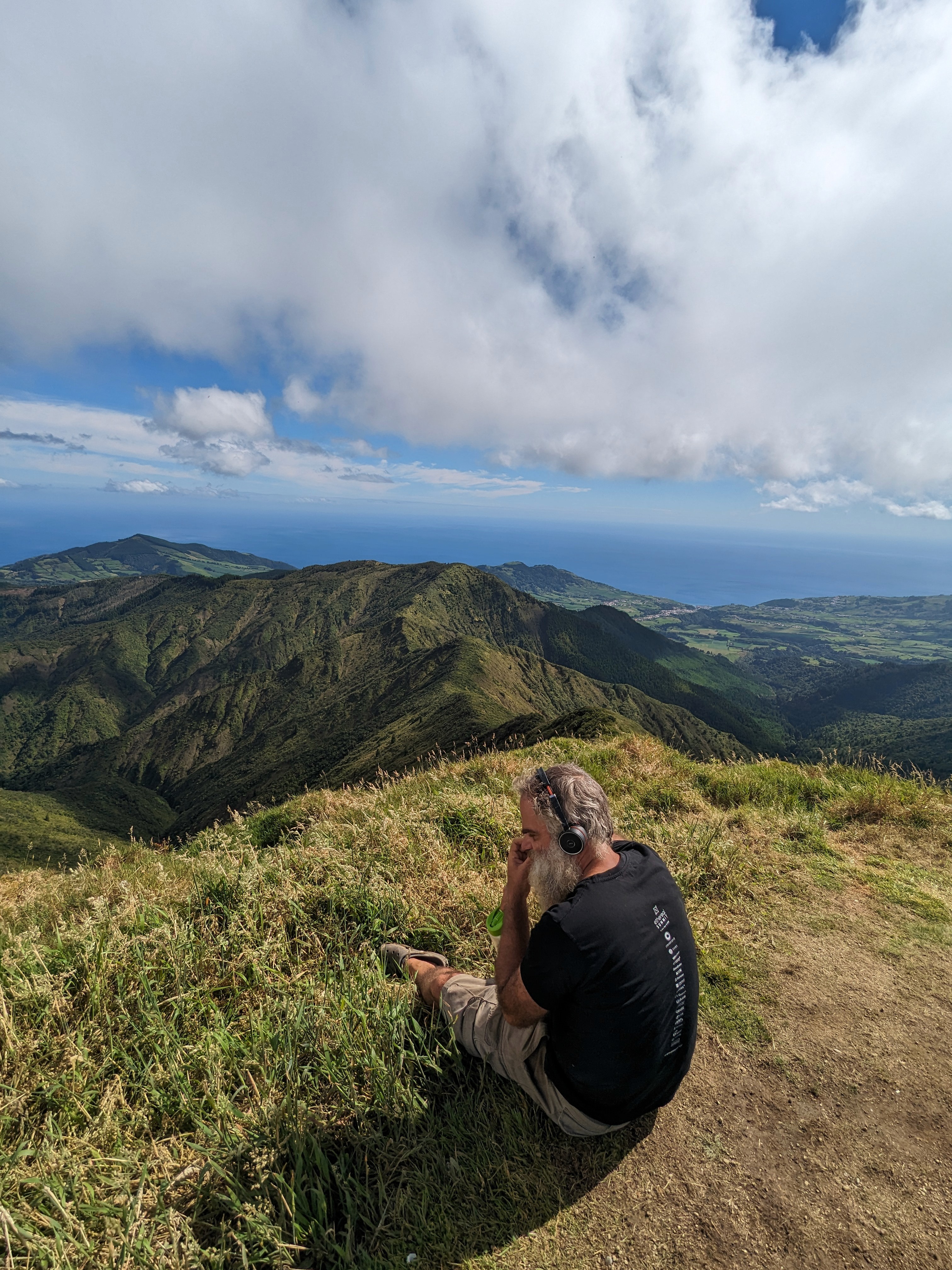 • Wearing a black t-shirt and headset ("on a call")